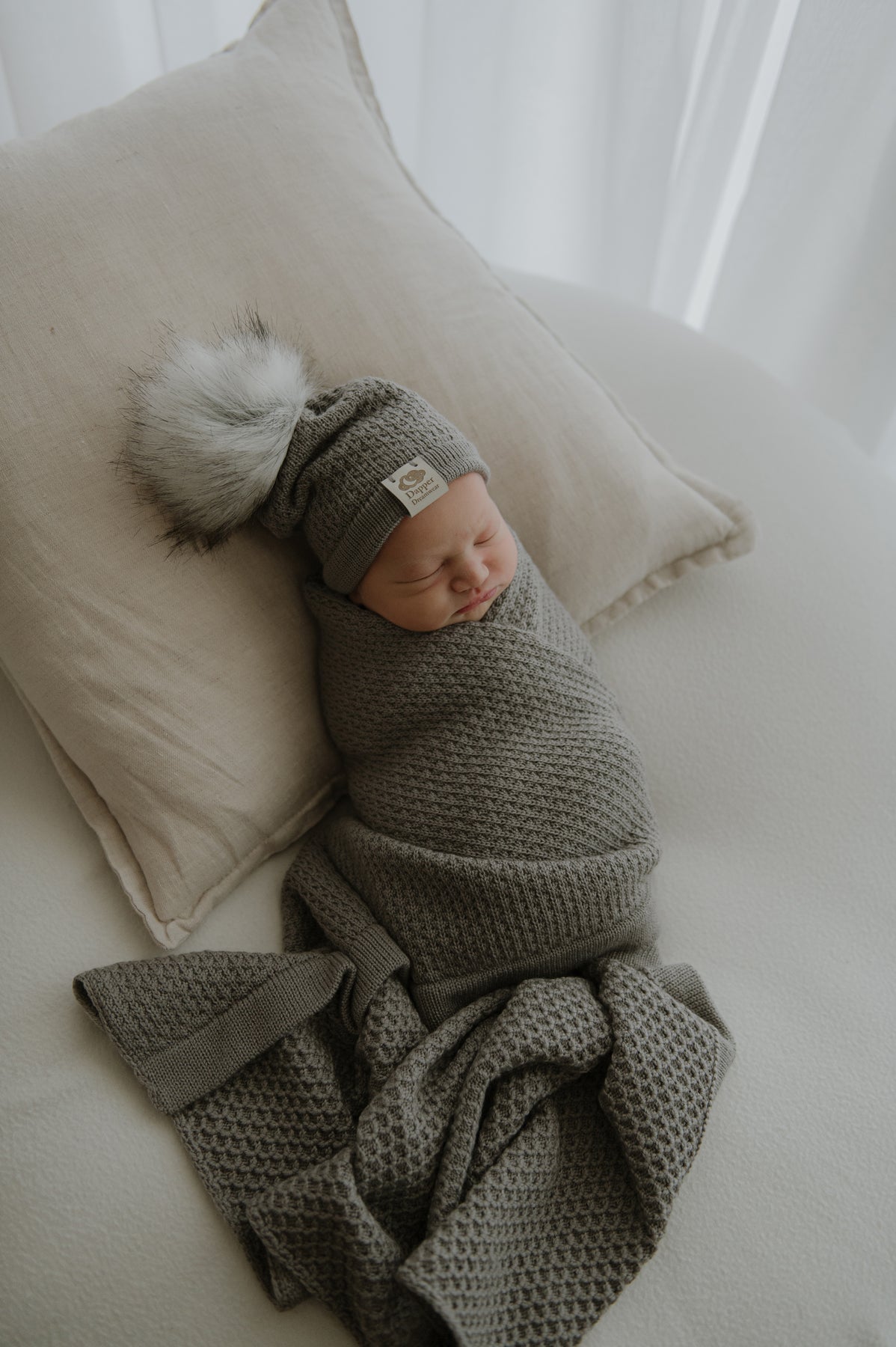 A grey merino wool baby blanket with a textured pattern and a matching beanie with a faux fur pom pom.