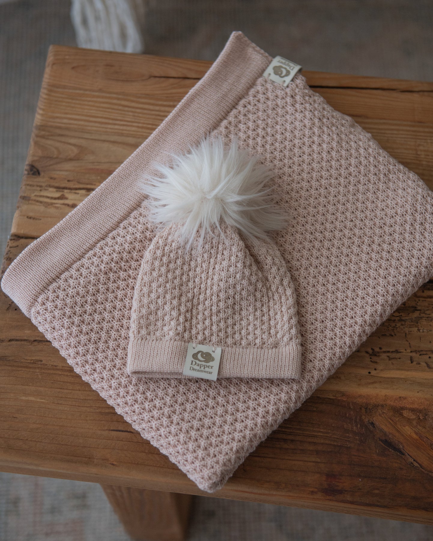 A honey coloured merino wool baby blanket with a textured pattern and a beanie with a pom-pom, displayed on a wooden surface.